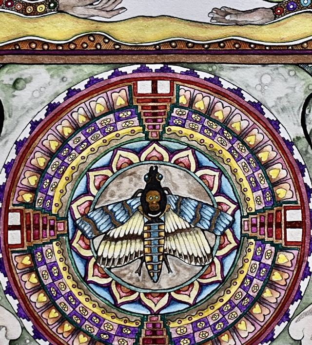 Cette œuvre de 80/60 cm, terminée le 3/11/2024 et commencé le 15/03/2024 est réalisée à l'aquarelle, l’aquarelle luminescente, l’acrylique, le crayon mine, et l'encre de Chine.