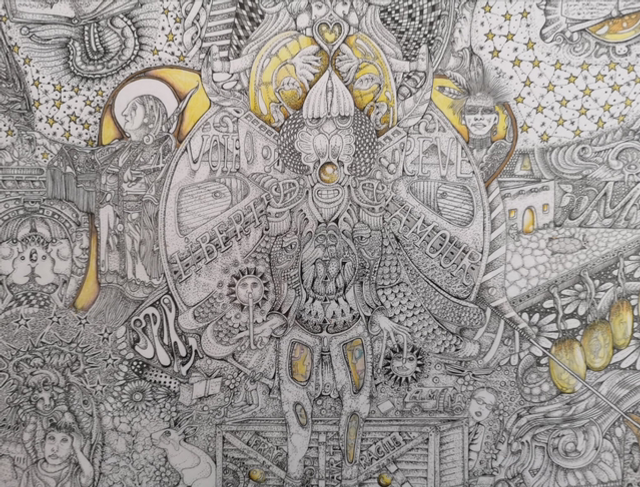Toile de 80/36 sur papier cartonnée avec crayon mine noire, encre de chine et pastel. Elle est bordée d'une poésie à deux mains écrite avec la poétesse Anouk Journo